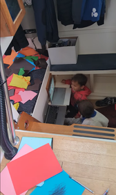 A: We access ACC DE using a Starlink mini powered by solar panels. Our ‘classroom’ is the saloon - the main living area of the catamaran. It's very cosy and serves as our office, lounge room, dining room, and playroom all in one!